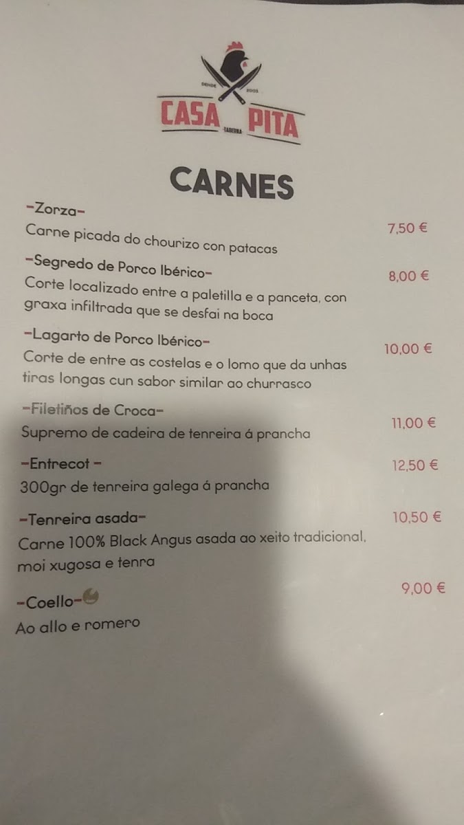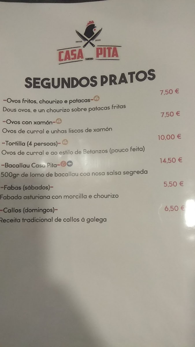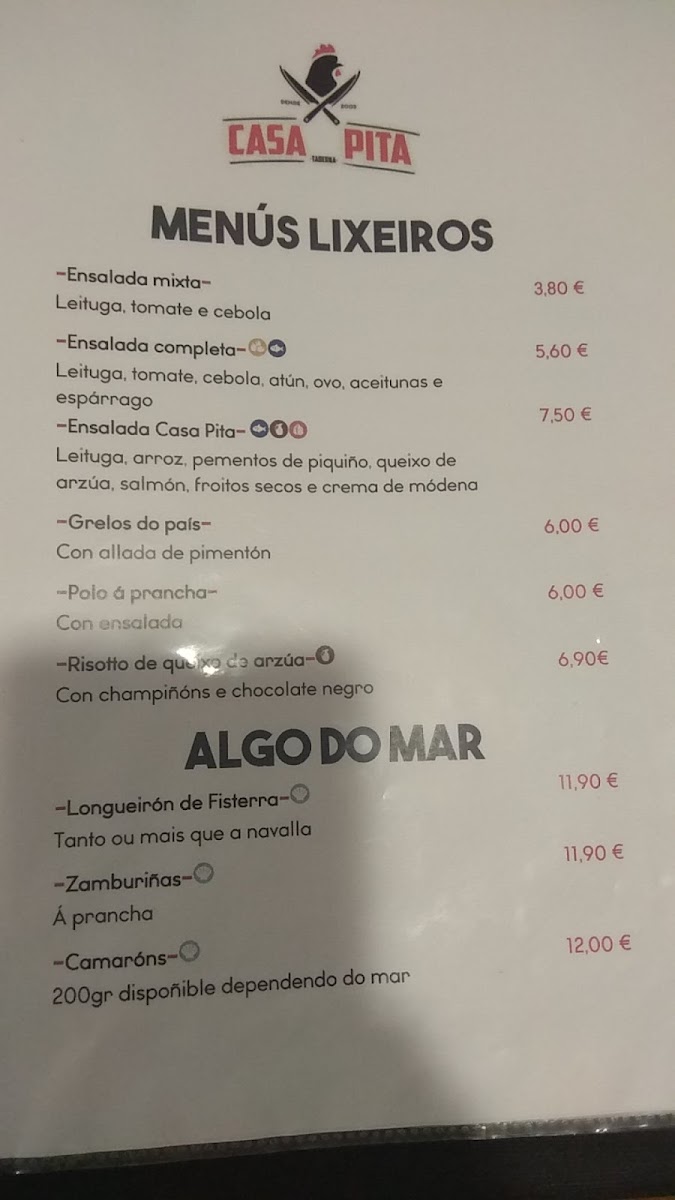 Restaurante Casa Pita offers a delightful menu that showcases the rich flavors of Galician cuisine. One of the standout dishes is Pulpo, a tender and flavorful octopus that captures the essence of local seafood. Another must-try is the Calamares, perfectly fried squid served with a light batter, making it a great choice for seafood lovers. For a more hearty experience, the Cocido Gallego is a standout, featuring a robust stew filled with a variety of meats, vegetables, and chickpeas. The Sopa de Cocido complements the cocido with its rich broth and comforting texture, making it a perfect starter. To balance the heartiness, the Patatas Y Grelos provide a refreshing side dish of potatoes and turnip greens, which add a wonderful contrast in both flavor and texture. For dessert, the Tarta Da Avoa is a sweet end to the meal, offering a traditional Galician cake that is both moist and indulgent. The menu at Restaurante Casa Pita is a true celebration of local ingredients and time-honored recipes, ensuring a memorable dining experience for all guests.